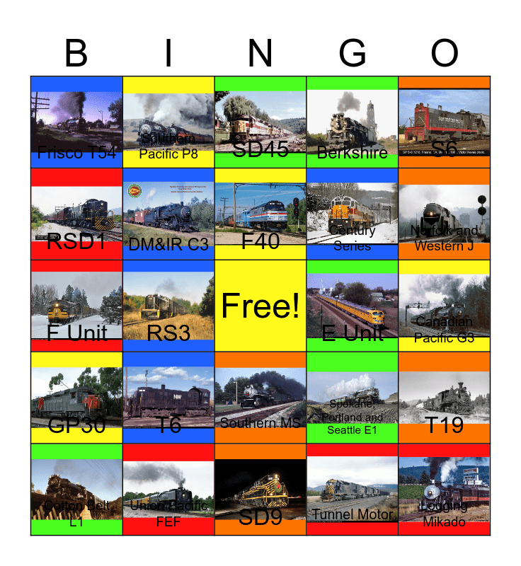 This bingo card has 24 images, a free space and 24 words: T6, Union Pacific FEF, F40, Cotton Belt L1, S6, Frisco T54, RSD1, Southern Pacific P8, E Unit, Southern MS, Century Series, F Unit, Spokane, Portland and Seattle E1, T19, DM&IR C3, Tunnel Motor, Canadian Pacific G3, SD45, Norfolk and Western J, RS3, Logging Mikado, GP30, Berkshire and SD9.