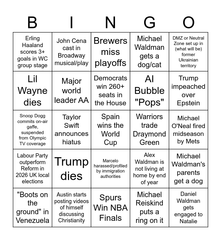 This bingo card has 25 words: Trump dies, Spurs Win NBA Finals, Democrats win 260+ seats in the House, "Boots on the ground" in Venezuela, DMZ or Neutral Zone set up in (what will be) former Ukrainian territory, Erling Haaland scores 3+ goals in WC group stage, Lil Wayne dies, John Cena cast in Broadway musical/play, Warriors trade Draymond Green, Marcelo harassed/profiled by immigration authorities, AI Bubble "Pops", Snoop Dogg commits on-air gaffe, suspended from Olympic TV coverage, Alex Waldman is not living at home by end of year, Michael Waldman's parents get a dog, Major world leader AA, Daniel Waldman gets engaged to Natalie, Michael O'Neal fired midseason by Mets, Brewers miss playoffs, Trump impeached over Epstein, Taylor Swift announces hiatus, Spain wins the World Cup, Austin starts posting videos of himself discussing Christianity, Labour Party outperform Reform in 2026 UK local elections, Michael Waldman gets a dog/cat and Michael Reiskind puts a ring on it.