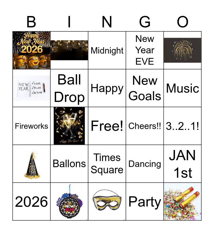 This bingo card has 12 images, a free space and 17 words: 2026, Family & Friends, New Year resolution, Midnight, Ball Drop, Ballons, Cheers!!, 3..2..1!, Party, Music, Times Square, Fireworks, Dancing, New Goals, New Year EVE, JAN 1st and Happy.