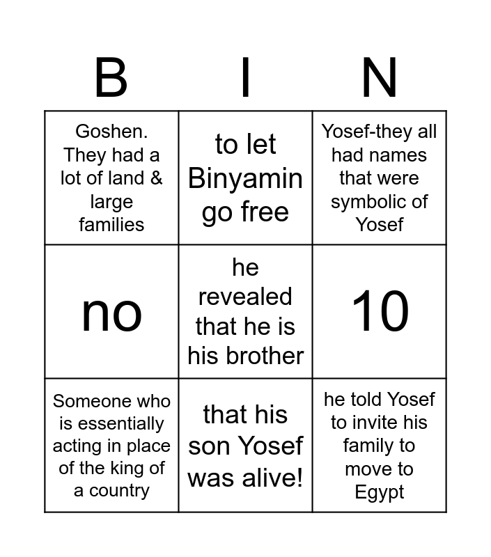 This bingo card has 13 words: VaYigash, Yosef, Someone who is essentially acting in place of the king of a country, to let Binyamin go free, no, he revealed that he is his brother, he told Yosef to invite his family to move to Egypt, gifts & clothes, that his son Yosef was alive!, Goshen. They had a lot of land & large families, 10, Yosef-they all had names that were symbolic of Yosef and because his father Yitzchok davened there & it is a special place.