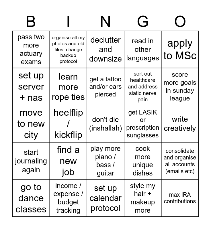 This bingo card has a free space and 24 words: find a new job, income / expense / budget tracking, get a tattoo and/or ears pierced, go to dance classes, apply to MSc, pass two more actuary exams, set up server + nas, organise all my photos and old files, change backup protocol, get LASIK or prescription sunglasses, play more piano / bass / guitar, sort out healthcare and address siatic nerve pain, move to new city, cook more unique dishes, consolidate and organise all accounts (emails etc), learn more rope ties, style my hair + makeup more, write creatively, declutter and downsize, score more goals in sunday league, heelflip / kickflip, max IRA contributions, start journaling again, read in other languages and set up calendar protocol.