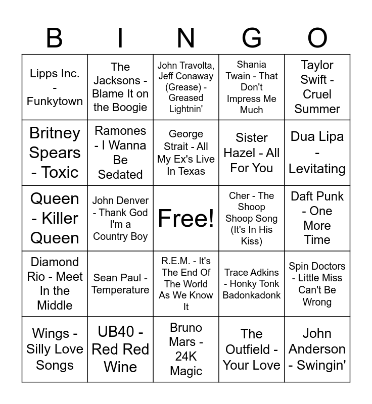 This bingo card has a free space and 35 words: Tom Petty and the Heartbreakers - Don't Do Me Like That, CHIC - Le Freak, The Cars - My Best Friend's Girl, Ramones - I Wanna Be Sedated, R.E.M. - It's The End Of The World As We Know It, Shania Twain - That Don't Impress Me Much, Britney Spears - Toxic, War - Low Rider, George Strait - All My Ex's Live In Texas, Green Day - Holiday, Queen - Killer Queen, Taylor Swift - Cruel Summer, Todd Rundgren - Bang the Drum All Day, The Killers - Mr. Brightside, Lipps Inc. - Funkytown, Cher - The Shoop Shoop Song (It's In His Kiss), The Outfield - Your Love, John Denver - Thank God I'm a Country Boy, Diamond Rio - Meet In the Middle, John Anderson - Swingin', Trace Adkins - Honky Tonk Badonkadonk, Wings - Silly Love Songs, Spin Doctors - Little Miss Can't Be Wrong, UB40 - Red Red Wine, John Travolta, Jeff Conaway (Grease) - Greased Lightnin', Dua Lipa - Levitating, EMF - Unbelievable, Bobby McFerrin - Don't Worry Be Happy, Sister Hazel - All For You, Daft Punk - One More Time, Jessie J, Ariana Grande, Nicki Minaj - Bang Bang, Bruno Mars - 24K Magic, Sean Paul - Temperature, The Jacksons - Blame It on the Boogie and Van Halen - Dance the Night Away.
