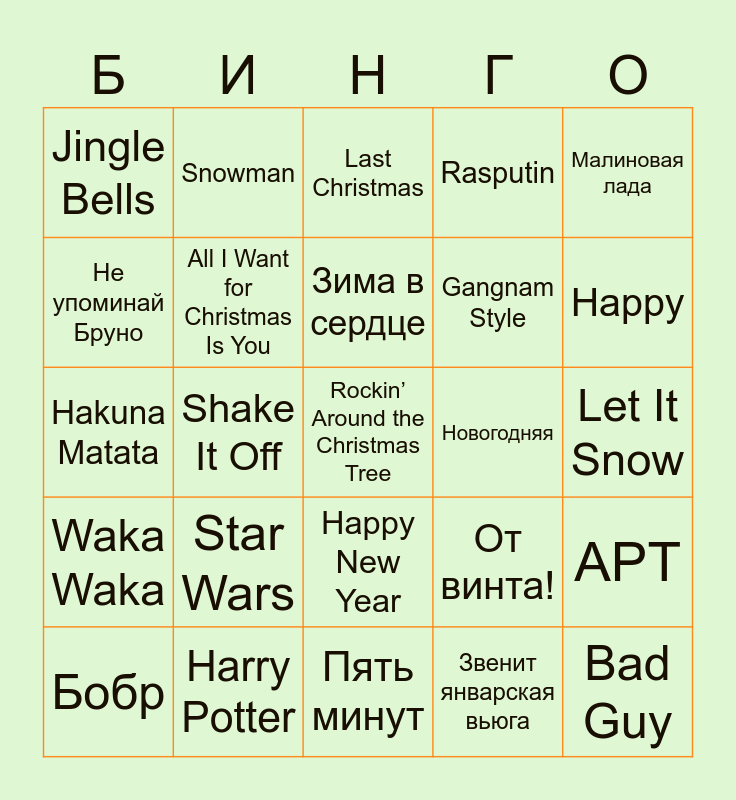 This bingo card has 30 words: Harry Potter, Отпусти и забудь, Shake It Off, В лесу родилась ёлочка, Jingle Bells, Last Christmas, All I Want for Christmas Is You, Happy New Year, Новогодняя, Пять минут, Let It Snow, Rockin’ Around the Christmas Tree, Звенит январская вьюга, Bad Guy, Happy, All Star, От винта!, Waka Waka, Star Wars, Малиновая лада, Hakuna Matata, Три белых коня, Snowman, Gangnam Style, Не упоминай Бруно, Rasputin, APT, Бобр, Зима в сердце and Baby Shark.