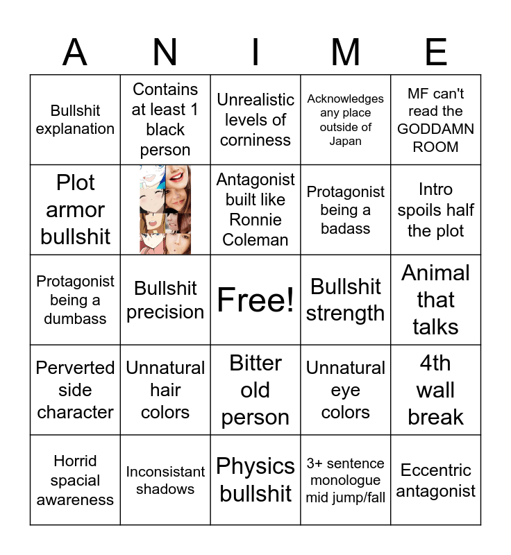 This bingo card has 1 images, a free space and 23 words: Unnatural hair colors, Inconsistant shadows, Antagonist built like Ronnie Coleman, Horrid spacial awareness, MF can't read the GODDAMN ROOM, Bullshit explanation, Plot armor bullshit, Contains at least 1 black person, Bullshit strength, Bitter old person, Protagonist being a badass, Protagonist being a dumbass, Unnatural eye colors, 4th wall break, 3+ sentence monologue mid jump/fall, Animal that talks, Unrealistic levels of corniness, Intro spoils half the plot, Bullshit precision, Eccentric antagonist, Perverted side character, Acknowledges any place outside of Japan and Physics bullshit.