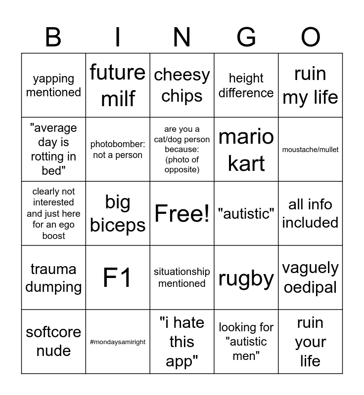 This bingo card has a free space and 24 words: F1, #mondaysamiright, are you a cat/dog person because: (photo of opposite), softcore nude, ruin my life, yapping mentioned, "average day is rotting in bed", future milf, "autistic", situationship mentioned, mario kart, clearly not interested and just here for an ego boost, rugby, vaguely oedipal, photobomber: not a person, looking for "autistic men", all info included, cheesy chips, moustache/mullet, big biceps, ruin your life, trauma dumping, height difference and "i hate this app".
