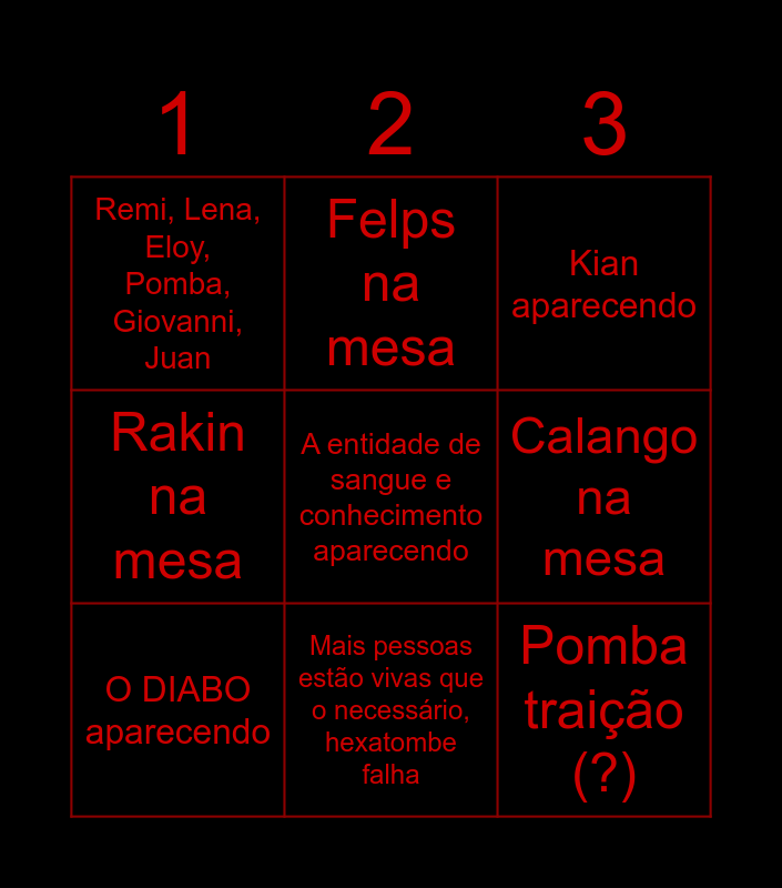 This bingo card has a free space and 8 words: Rakin na mesa, Felps na mesa, Calango na mesa, O DIABO aparecendo, Kian aparecendo, Remi, Lena, Eloy, Pomba, Giovanni, Juan, Mais pessoas estão vivas que o necessário, hexatombe falha and Pomba traição (?).