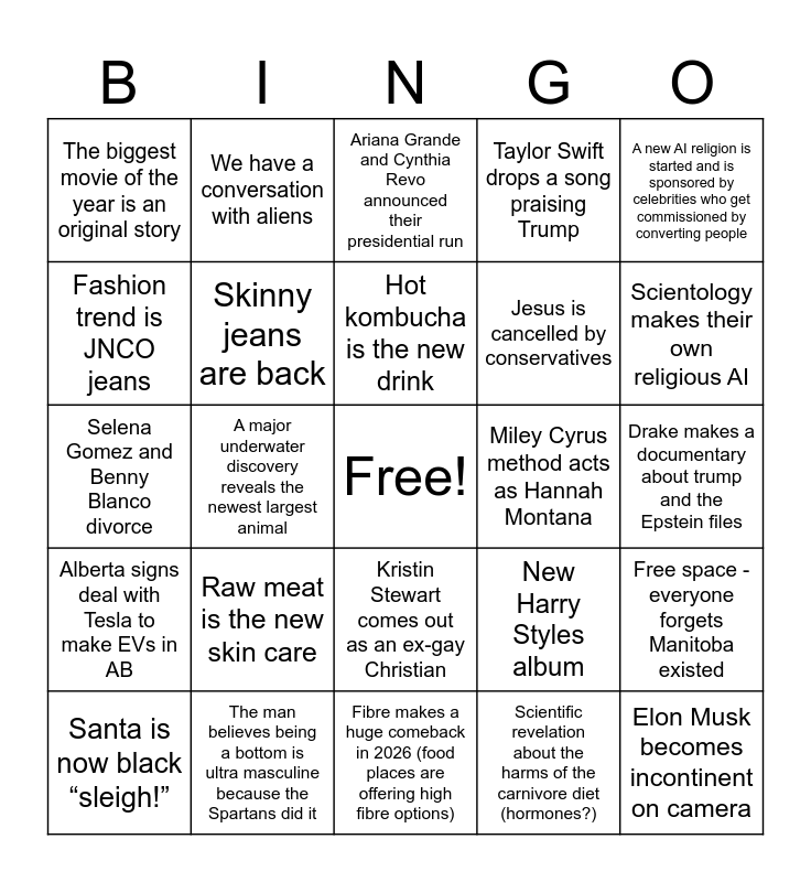 This bingo card has a free space and 44 words: Olivia Rodrigo Sabrina Carpenter and Joshua Bassett soft-launch being a throuple, Elon Musk becomes incontinent on camera, Ozempic becomes Over-the-counter, Santa is now black “sleigh!”, Elon Musk is charged with murder for failed Mars launch attempt, Scientific revelation about the harms of the carnivore diet (hormones?), Ariana Grande and Cynthia Revo announced their presidential run, Charlie Kirk is found alive, A new AI religion is started and is sponsored by celebrities who get commissioned by converting people, The man believes being a bottom is ultra masculine because the Spartans did it, Taylor Swift drops a song praising Trump, Miley Cyrus method acts as Hannah Montana, Kristin Stewart comes out as an ex-gay Christian, Raw meat is the new skin care, Capt’n Crunch is killed, Fibre makes a huge comeback in 2026 (food places are offering high fibre options), Canada wins FIFA, Selena Gomez and Benny Blanco divorce, Joe Jonas and Demi Lovato try again, Scientology makes their own religious AI, We have a conversation with aliens, Ben Affleck and Jennifer Lopez get married again, Canadian Parliament had an orgy in the building, The biggest movie of the year is an original story, Tim Hortons wins International Coffee of the year, Drake makes a documentary about trump and the Epstein files, Justin Trudeau comes out as Bi, Harry Styles and Obama were real confirmed, New Harry Styles album, Alberta signs deal with Tesla to make EVs in AB, Canada removes French as second language, Free space - everyone forgets Manitoba existed, Earth has a new moon, Dinosaurs are labelled as woke, A major underwater discovery reveals the newest largest animal, One of the cryptids is revealed to be real, The new fashion trend is no more eyelashes, Celebrity promotes unibrows, Hot kombucha is the new drink, Fashion trend is JNCO jeans, Jesus is cancelled by conservatives, Donald Trump dies, Skinny jeans are back and Blogalaties releases Workout tassels.