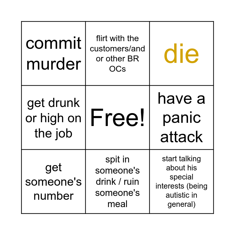 This bingo card has a free space and 8 words: have a panic attack, die, flirt with the customers/and or other BR OCs, get someone's number, commit murder, start talking about his special interests (being autistic in general), get drunk or high on the job and spit in someone's drink / ruin someone's meal.