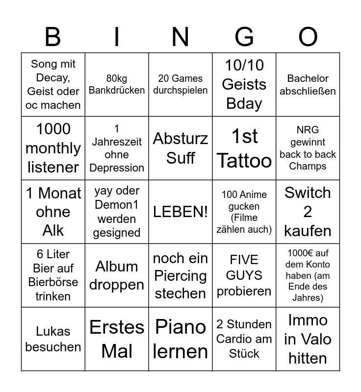 This bingo card has a free space and 24 words: Album droppen, Erstes Mal, Absturz Suff, Lukas besuchen, Bachelor abschließen, Song mit Decay, Geist oder oc machen, 1000 monthly listener, 80kg Bankdrücken, 100 Anime gucken (Filme zählen auch), noch ein Piercing stechen, 1st Tattoo, 1 Monat ohne Alk, FIVE GUYS probieren, 1000€ auf dem Konto haben (am Ende des Jahres), 1 Jahreszeit ohne Depression, 2 Stunden Cardio am Stück, Switch 2 kaufen, 20 Games durchspielen, NRG gewinnt back to back Champs, yay oder Demon1 werden gesigned, Immo in Valo hitten, 6 Liter Bier auf Bierbörse trinken, 10/10 Geists Bday and Piano lernen.
