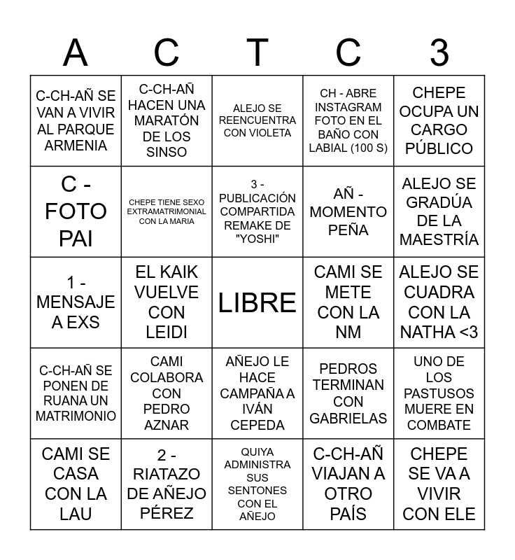This bingo card has a free space and 31 words: QUIYA ADMINISTRA SUS SENTONES CON EL AÑEJO, CHEPE SE DEVUELVE A BOGOTÁ, EL KAIK VUELVE CON LEIDI, CAMI VUELVE A LA ALCALDÍA A TRABAJAR, C-CH-AÑ SE VAN A VIVIR AL PARQUE ARMENIA, ALEJO SE REENCUENTRA CON VIOLETA, CHEPE TIENE SEXO EXTRAMATRIMONIAL CON LA MARIA, PEDROS TERMINAN CON GABRIELAS, CAMI SE METE CON LA NM, C-CH-AÑ VIAJAN A OTRO PAÍS, ALEJO SE CUADRA CON LA NATHA <3, CHEPE SE VA A VIVIR CON ELE, CAMI SE PELEA CON TODAS SUS BANDAS, C-CH-AÑ LLORAN JUNTOS ESCUCHANDO SONORA PONCEÑA, ALEJO SE GRADÚA DE LA MAESTRÍA, CHEPE PECA CON LA GABI P, UNO DE LOS PASTUSOS MUERE EN COMBATE, CAMI COLABORA CON PEDRO AZNAR, C-CH-AÑ SE PONEN DE RUANA UN MATRIMONIO, AÑEJO LE HACE CAMPAÑA A IVÁN CEPEDA, CHEPE OCUPA UN CARGO PÚBLICO, MESIÉ PERINÉ TOCA EN UNA PEÑA, CAMI SE CASA CON LA LAU, C-CH-AÑ HACEN UNA MARATÓN DE LOS SINSO, AÑ - MOMENTO PEÑA, C - FOTO PAI, CH - ABRE INSTAGRAM FOTO EN EL BAÑO CON LABIAL (100 S), 1 - MENSAJE A EXS, 2 - RIATAZO DE AÑEJO PÉREZ, 3 - PUBLICACIÓN COMPARTIDA REMAKE DE "YOSHI" and 4 - SE LANZAN A ALGO DE LA POLÍTICA.