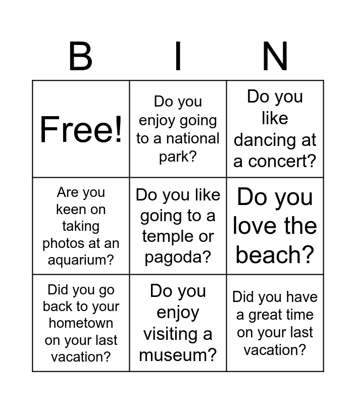 This bingo card has 9 words: Did you go back to your hometown on your last vacation?, Do you like dancing at a concert?, Do you enjoy going to a national park?, Are you keen on taking photos at an aquarium?, Free!, Do you love the beach?, Do you like going to a temple or pagoda?, Did you have a great time on your last vacation? and Do you enjoy visiting a museum?.