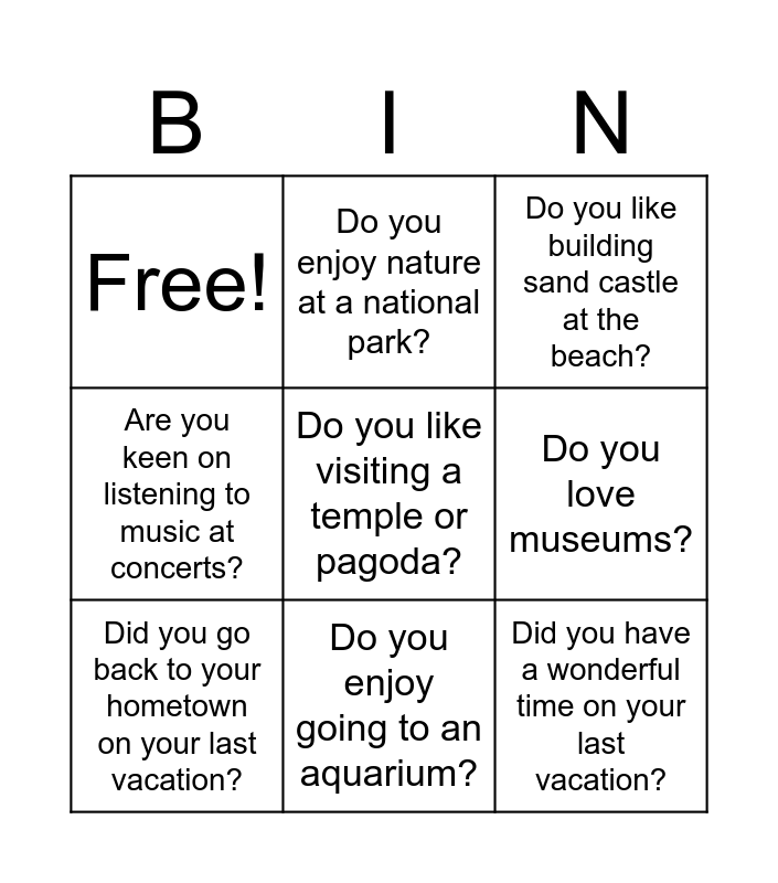 This bingo card has 9 words: Did you go back to your hometown on your last vacation?, Do you like building sand castle at the beach?, Do you enjoy nature at a national park?, Are you keen on listening to music at concerts?, Free!, Do you love museums?, Do you like visiting a temple or pagoda?, Did you have a wonderful time on your last vacation? and Do you enjoy going to an aquarium?.