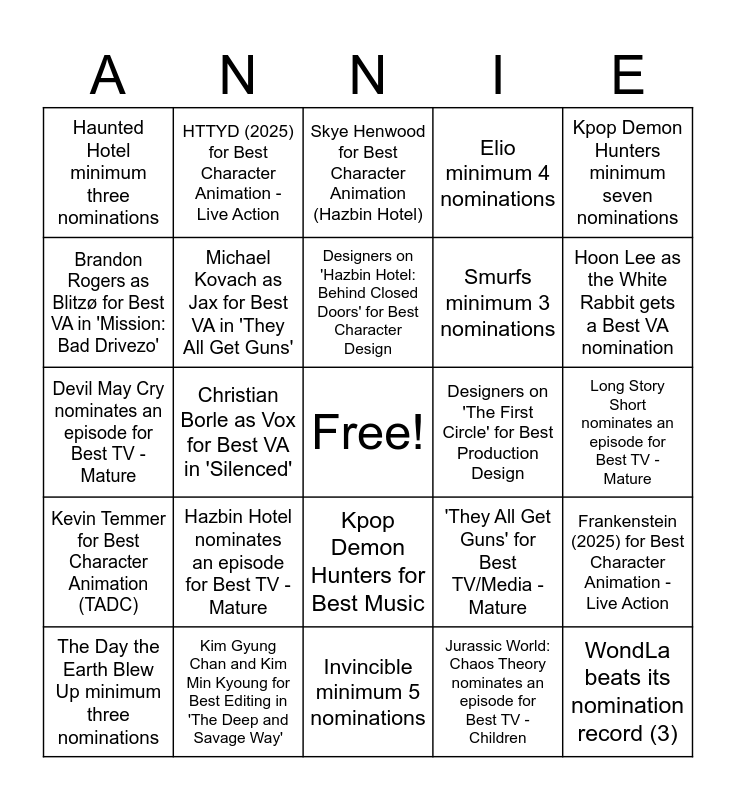 This bingo card has a free space and 33 words: Alex Rochon as Caine for Best VA in 'Untitled', Amir Talai as Alastor for Best VA in 'It's a Deal', Christian Borle as Vox for Best VA in 'Silenced', Jeremy Jordan as Lucifer for Best VA in 'Silenced', Kevin Temmer for Best Character Animation (TADC), Michael Kovach as Jax for Best VA in 'They All Get Guns', Kpop Demon Hunters minimum seven nominations, The Day the Earth Blew Up minimum three nominations, HTTYD (2025) for Best Character Animation - Live Action, Fantastic Four: First Steps for Best Character Animation - Live Action, Designers on 'Hazbin Hotel: Behind Closed Doors' for Best Character Design, Skye Henwood for Best Character Animation (Hazbin Hotel), Gooseworx and Evan Alderete for Best Music in 'They All Get Guns', Alex Seaver for Best Music in 'The First Circle', Designers on 'The First Circle' for Best Production Design, Hoon Lee as the White Rabbit gets a Best VA nomination, Kim Gyung Chan and Kim Min Kyoung for Best Editing in 'The Deep and Savage Way', Devil May Cry nominates an episode for Best TV - Mature, Hazbin Hotel nominates an episode for Best TV - Mature, 'They All Get Guns' for Best TV/Media - Mature, Kpop Demon Hunters for Best Music, Haft and Underberg for Best Music in either 'Storyteller' OR 'Silenced', Haunted Hotel minimum three nominations, Long Story Short nominates an episode for Best TV - Mature, Invincible minimum 5 nominations, WondLa beats its nomination record (3), Elio minimum 4 nominations, Smurfs minimum 3 nominations, Brandon Rogers as Blitzø for Best VA in 'Mission: Bad Drivezo', Frankenstein (2025) for Best Character Animation - Live Action, Fiona and Cake beats its nomination record (1), Jurassic World: Chaos Theory nominates an episode for Best TV - Children and JW:CT season 4 manages to sneak in a nomination.