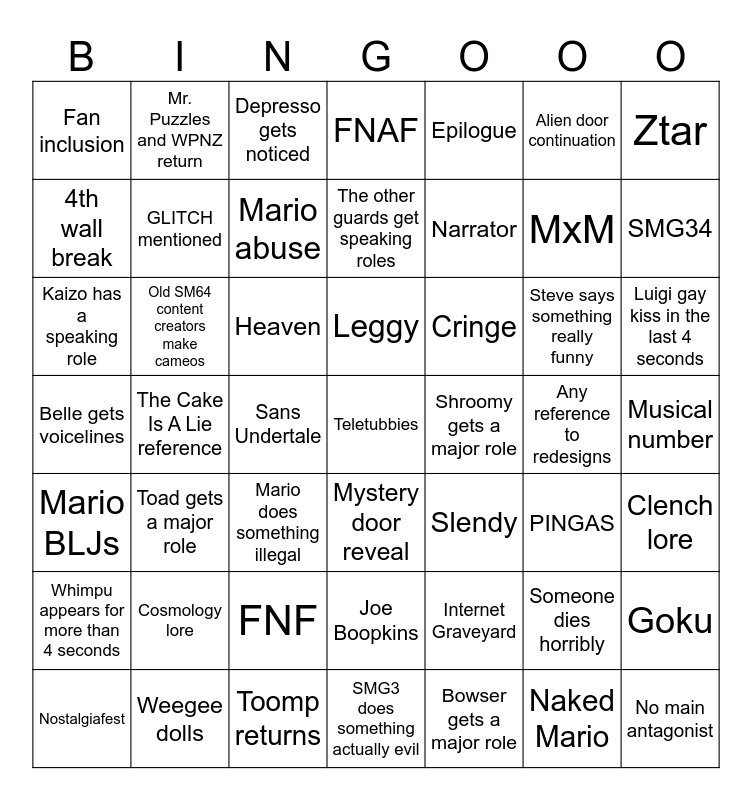 This bingo card has 49 words: Someone dies horribly, MxM, Bowser gets a major role, The Cake Is A Lie reference, Heaven, Musical number, Mr. Puzzles and WPNZ return, Toomp returns, Alien door continuation, Mystery door reveal, Ztar, FNAF, Steve says something really funny, Cringe, Cosmology lore, Any reference to redesigns, 4th wall break, SMG34, Goku, Epilogue, Narrator, Sans Undertale, Fan inclusion, GLITCH mentioned, Nostalgiafest, Mario abuse, Luigi gay kiss in the last 4 seconds, Weegee dolls, Leggy, Old SM64 content creators make cameos, No main antagonist, Shroomy gets a major role, Whimpu appears for more than 4 seconds, FNF, Belle gets voicelines, Slendy, PINGAS, Clench lore, Kaizo has a speaking role, Mario does something illegal, Joe Boopkins, Mario BLJs, Teletubbies, SMG3 does something actually evil, The other guards get speaking roles, Depresso gets noticed, Internet Graveyard, Toad gets a major role and Naked Mario.