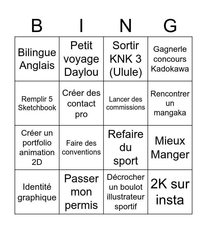 This bingo card has 16 words: Passer mon permis, Mieux Manger, Sortir KNK 3 (Ulule), Bilingue Anglais, Créer un portfolio animation 2D, Petit voyage Daylou, Refaire du sport, Décrocher un boulot illustrateur sportif, Remplir 5 Sketchbook, Créer des contact pro, Identité graphique, Gagnerle concours Kadokawa, Faire des conventions, Rencontrer un mangaka, Lancer des commissions and 2K sur insta.