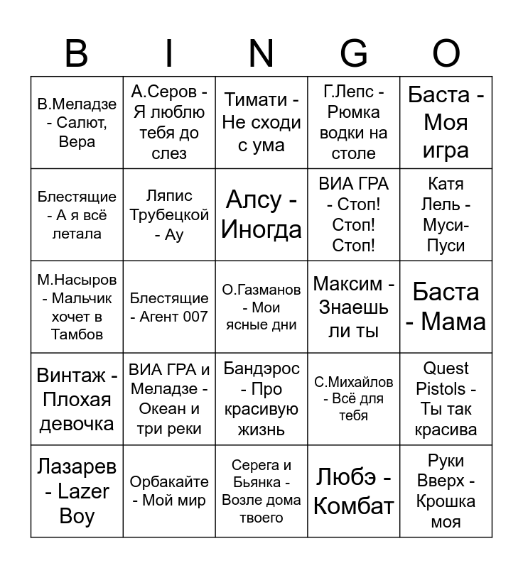 This bingo card has 64 words: IOWA - Маршрутка, JONY - Комета, Mband - Она вернётся, Quest Pistols - Ты так красива, Quest Pistols - Я устал, Uma2rman - Папины дочки, А.Серов - Я люблю тебя до слез, Агутин и Пресняков - Аэропорты, Алсу - Иногда, Андрей Губин - Ночь, Бандэрос - Про красивую жизнь, Басков - Я буду руки твои целовать, Баста - Мама, Баста - Моя игра, Баста - Сансара, Блестящие - А я всё летала, Блестящие - Агент 007, В.Меладзе - Салют, Вера, Ваенга - Курю, ВИА ГРА - Стоп!Стоп!Стоп!, ВИА ГРА и Меладзе - Океан и три реки, Винтаж - Плохая девочка, Г.Лепс - Рюмка водки на столе, Г.Сукачёв - Моя бабушка курит трубку, Город 312 - Останусь, Гости из будущего - Зима в сердце, Гуф - Ice baby, Дискотека Авария - Если хочешь остаться, Ж.Белоусов - Девочка-девчонка, Звери - До скорой встречи!, Земфира - Искала, И.Итляшев - Кобра, Кадышева - Течет ручей, Кадышева - Широка река, Катя Лель - Муси-Пуси, Лазарев - Lazer Boy, Лолита - Ориентация север, Любэ - Комбат, Любэ - Конь, Ляпис Трубецкой - Ау, М.Насыров - Мальчик хочет в Тамбов, Максим - Знаешь ли ты, Н.Басков, Т.Повалий - Ты далеко, Натали - Ветер с моря дул, Непара - Плачь и смотри, О.Газманов - Мои ясные дни, Орбакайте - Мой мир, Руки Вверх - Крошка моя, С.Михайлов - Всё для тебя, С.Михайлов, Т.Повалий - Отпусти, С.Пьеха - На ладони линия, С.Трофимов - Город Сочи, Серега и Бьянка - Возле дома твоего, Слава - попутчица, Т.Белорусских - Незабудка, ТАТУ - Я сошла с ума, Тимати - Не сходи с ума, Ф.Киркоров - Просто подари, Фабрика - Не виноватая я, Фабрика - Про любовь, Чай вдвоем - желанная, Чай вдвоём - Просто друг, Чай вдвоём - Ты не одна and Ю.Савичева - Если в сердце живет любовь.