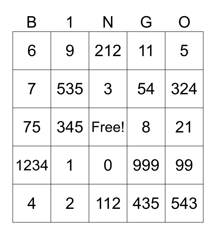 This bingo card has a free space and 24 words: 1, 2, 3, 4, 5, 6, 7, 9, 8, 0, 54, 75, 999, 99, 535, 435, 21, 212, 324, 345, 543, 1234, 11 and 112.