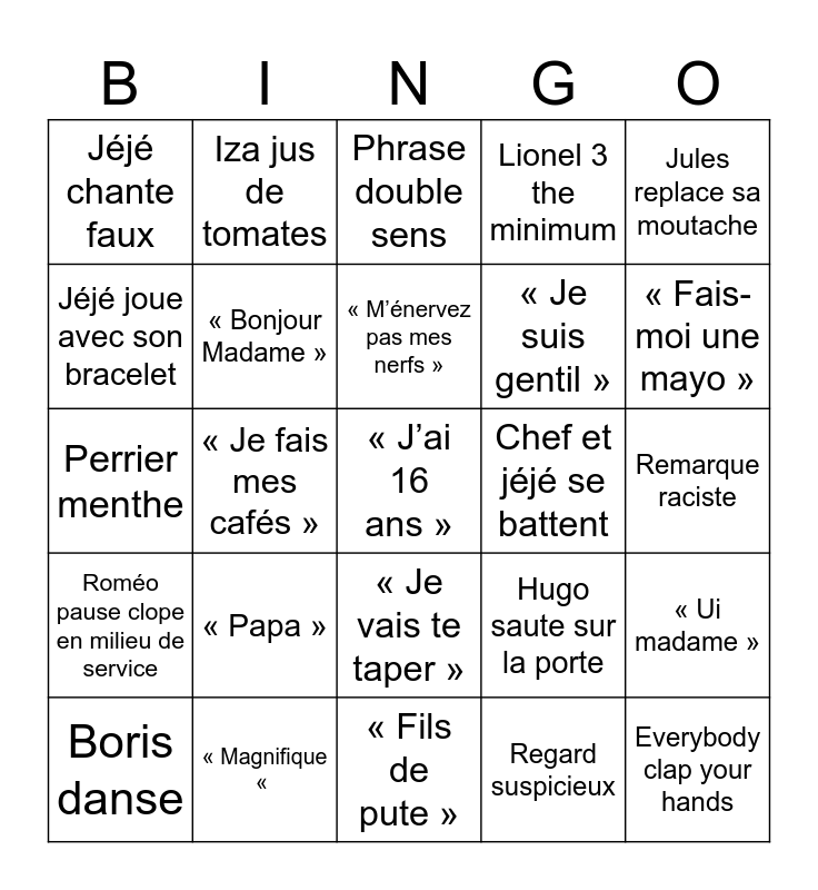 This bingo card has a free space and 24 words: « Papa », « Magnifique «, « M’énervez pas mes nerfs », Boris danse, Jules replace sa moutache, Jéjé chante faux, Jéjé joue avec son bracelet, Iza jus de tomates, Chef et jéjé se battent, « Je vais te taper », « Je suis gentil », Perrier menthe, Hugo saute sur la porte, « Ui madame », « Bonjour Madame », Regard suspicieux, Remarque raciste, Phrase double sens, « Fais-moi une mayo », « Je fais mes cafés », Everybody clap your hands, Roméo pause clope en milieu de service, Lionel 3 the minimum and « Fils de pute ».