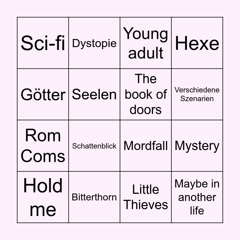 This bingo card has 30 words: Fantasy, Romance, Mystery, Classic, Sci-fi, Young adult, The book of doors, The house in the cerulean sea, Bitterthorn, Fahrenheit 451, Little Thieves, Hold me, Divine rivals, Better than the movies, Schattenblick, A good girl's guide to murder, The kindred, Maybe in another life, Ballett, Götter, Mordfall, Magie, Dystopie, Rom Coms, Seelen, Hexe, Fluch, Magische Kinder, Verschiedene Szenarien and Galaxy.
