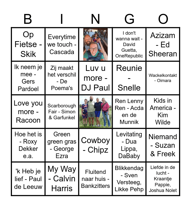 This bingo card has 5 images, a free space and 80 words: Ik moet zuipen - PartyfrieX, Schorre Chef, Iconisch - Bankzitters, Nachtenlang - Donnie, Yves Berendse, Vluchtstrook - Kriss Kross Amsterdam, Van Goes tot Purmerend - Jan Smit, Marco Schuitemaker, Hoe - Nielson, Miss Montreal, De Kapitein deel II - Acda en de Munnik, Zij maakt het verschil - De Poema's, Ren Lenny Ren - Acda en de Munnik, Stil in mij - Van Dik Hout, Op Fietse - Skik, 'k Heb je lief - Paul de Leeuw, Ik neem je mee - Gers Pardoel, Sexy als ik dans - Nielson, Als het avond is - Suzan & Freek, Holiday in Spain - Counting Crows, BLOF, Reunie - Snelle, Liefde in de lucht - Kraantje Pappie, Joshua Nolet, The sound of silence - Simon & Garfunkel, Scarborough Fair - Simon & Garfunkel, Mrs. Robinson - Simon & Garfunkel, Let it be - The Beatles, Jimmy - Boudewijn de Groot, Take a chance on me - ABBA, On top of the world - Imagine Dragons, Green green gras - George Ezra, I would stay - Krezip, Sweet goodbyes - Krezip, Love you more - Racoon, Wangedrag - Bankzitters, Bro Code - Bankzitters, Fluitend naar huis - Bankzitters, Ushuaia - Turfy Gang, Russo, Hoe het is - Roxy Dekker e.a., Wackelkontakt - Oimara, The fate of Ophelia - Tailor Swift, WHERE IS MY HUSBAND! - RAYE, Stay - Myles Smith, Hoogtevrees - Bente, Atlas - Pommelien Thijs, Riptide - Vance Joy, Hard to say goodbye - RONDÉ, Symphony - Clean Bandit, Zara Larsson, All Star - Smash Mouth, Who let the dogs out - Baha Men, Everytime we touch - Cascada, Luv u more - DJ Paul, Hava Naquila - Party Animals, Stars - Charly Lownoise, Mental Theo, American Idiot - Green Day, In too deep - Sum 41, My Way - Calvin Harris, I don't wanna wait - David Guetta, OneRepublic, I love it - Icona Pop, Charli xcx, We found love - Rihanna, Calvin Harris, Head & Heart - Joey Corry, MNEK, Rasputin - Majestic, Boney M., Royals - Lorde, Memories - Maroon 5, Sapphire - Ed Sheeran, Azizam - Ed Sheeran, Loser - Roxy Dekker, Niemand - Suzan & Freek, Nog even blijven - Douw Bob, MEAU, Heaven - DJ Sammy, Yanou, Do, In de blote kont - Mooi Wark, La Bamba - Los Lobos, Mama Laudaaa - Almklausi, Specktakel, Super Max! - Pitstop Boys, Het Bananenlied - De Boswachters, Cowboy - Chipz, Blikkendag - Sven Versteeg, Likke Pehp, Toveren - Herman van Veen, Girls just wanna have fun - Cindy Lauper, The Best - Tina Turner, Kids in America - Kim Wilde, My own worst enemy - Lit, High Hopes - Panic! at the disco, Levitating - Dua Lippa, DaBaby and abcdefu - GAYLE.