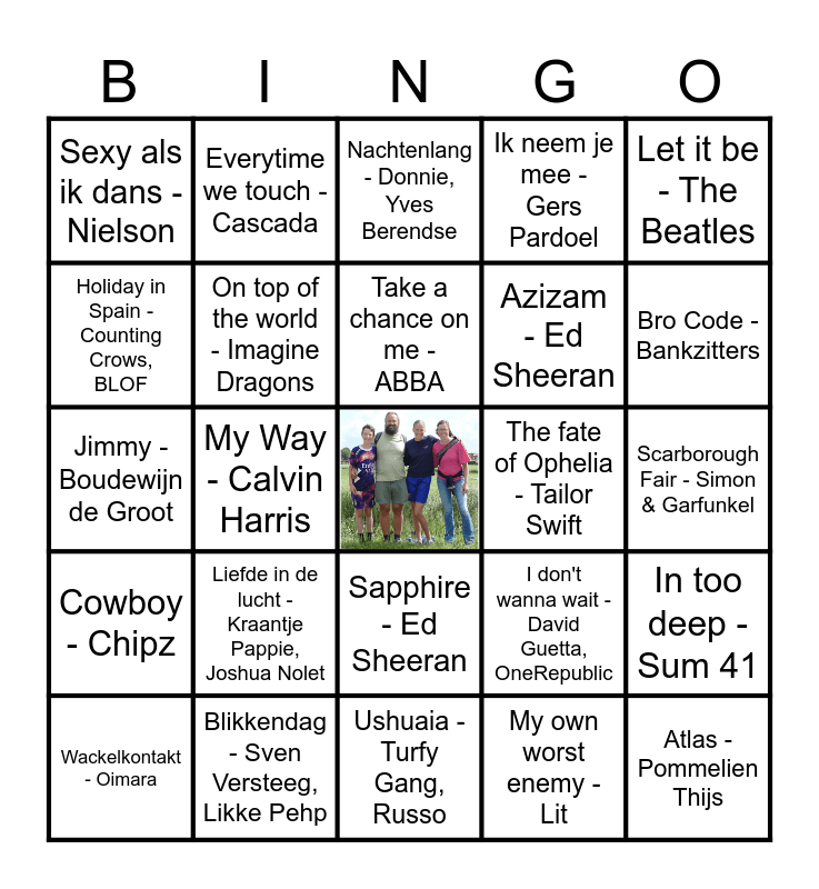 This bingo card has a free space and 80 words: Ik moet zuipen - PartyfrieX, Schorre Chef, Iconisch - Bankzitters, Nachtenlang - Donnie, Yves Berendse, Vluchtstrook - Kriss Kross Amsterdam, Van Goes tot Purmerend - Jan Smit, Marco Schuitemaker, Hoe - Nielson, Miss Montreal, De Kapitein deel II - Acda en de Munnik, Zij maakt het verschil - De Poema's, Ren Lenny Ren - Acda en de Munnik, Stil in mij - Van Dik Hout, Op Fietse - Skik, 'k Heb je lief - Paul de Leeuw, Ik neem je mee - Gers Pardoel, Sexy als ik dans - Nielson, Als het avond is - Suzan & Freek, Holiday in Spain - Counting Crows, BLOF, Reunie - Snelle, Liefde in de lucht - Kraantje Pappie, Joshua Nolet, The sound of silence - Simon & Garfunkel, Scarborough Fair - Simon & Garfunkel, Mrs. Robinson - Simon & Garfunkel, Let it be - The Beatles, Jimmy - Boudewijn de Groot, Take a chance on me - ABBA, On top of the world - Imagine Dragons, Green green gras - George Ezra, I would stay - Krezip, Sweet goodbyes - Krezip, Love you more - Racoon, Wangedrag - Bankzitters, Bro Code - Bankzitters, Fluitend naar huis - Bankzitters, Ushuaia - Turfy Gang, Russo, Hoe het is - Roxy Dekker e.a., Wackelkontakt - Oimara, The fate of Ophelia - Tailor Swift, WHERE IS MY HUSBAND! - RAYE, Stay - Myles Smith, Hoogtevrees - Bente, Atlas - Pommelien Thijs, Riptide - Vance Joy, Hard to say goodbye - RONDÉ, Symphony - Clean Bandit, Zara Larsson, All Star - Smash Mouth, Who let the dogs out - Baha Men, Everytime we touch - Cascada, Luv u more - DJ Paul, Hava Naquila - Party Animals, Stars - Charly Lownoise, Mental Theo, American Idiot - Green Day, In too deep - Sum 41, My Way - Calvin Harris, I don't wanna wait - David Guetta, OneRepublic, I love it - Icona Pop, Charli xcx, We found love - Rihanna, Calvin Harris, Head & Heart - Joey Corry, MNEK, Rasputin - Majestic, Boney M., Royals - Lorde, Memories - Maroon 5, Sapphire - Ed Sheeran, Azizam - Ed Sheeran, Loser - Roxy Dekker, Niemand - Suzan & Freek, Nog even blijven - Douw Bob, MEAU, Heaven - DJ Sammy, Yanou, Do, In de blote kont - Mooi Wark, La Bamba - Los Lobos, Mama Laudaaa - Almklausi, Specktakel, Super Max! - Pitstop Boys, Het Bananenlied - De Boswachters, Cowboy - Chipz, Blikkendag - Sven Versteeg, Likke Pehp, Toveren - Herman van Veen, Girls just wanna have fun - Cindy Lauper, The Best - Tina Turner, Kids in America - Kim Wilde, My own worst enemy - Lit, High Hopes - Panic! at the disco, Levitating - Dua Lippa, DaBaby and abcdefu - GAYLE.