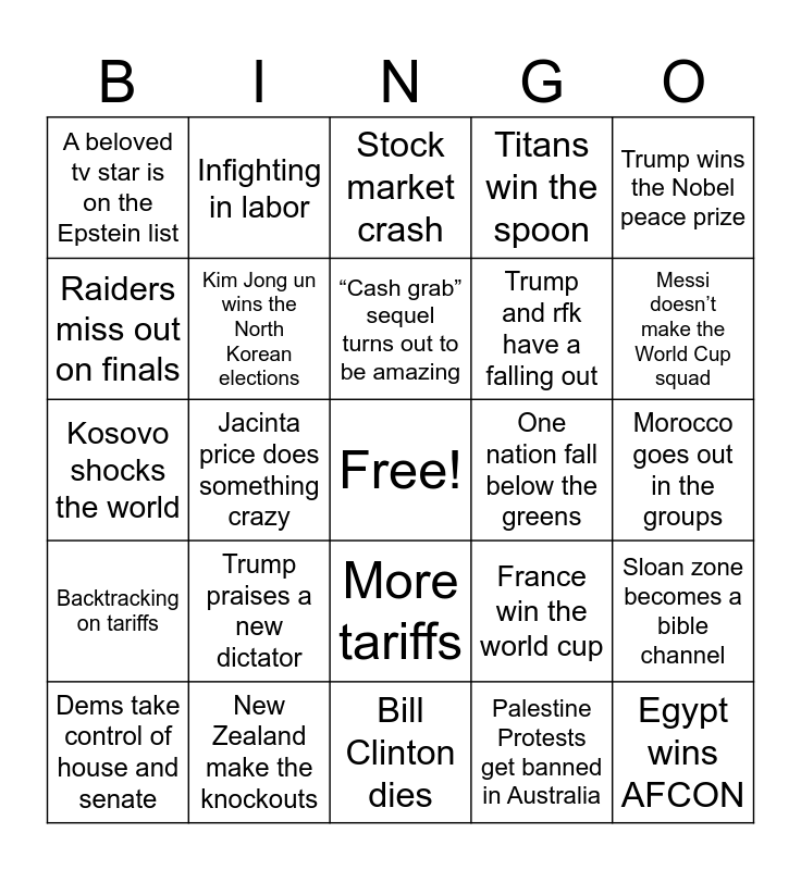 This bingo card has a free space and 29 words: Dems take control of house and senate, Less than 5 coalition seats at the SA election, Jacinta price does something crazy, Sussan ley invents a controversy, A beloved tv star is on the Epstein list, Stock market crash, Kim Jong un wins the North Korean elections, Trump praises a new dictator, One nation fall below the greens, New Zealand make the knockouts, Morocco goes out in the groups, Egypt wins AFCON, Bill Clinton dies, Palestine Protests get banned in Australia, Messi doesn’t make the World Cup squad, Ipswich get promoted, More tariffs, Backtracking on tariffs, Trump wins the Nobel peace prize, Kosovo shocks the world, France win the world cup, Famous store brand goes bankrupt, Trump and rfk have a falling out, Raiders miss out on finals, Titans win the spoon, Infighting in labor, Sloan zone becomes a bible channel, “Cash grab” sequel turns out to be amazing and Pauline Hanson embarrasses herself on 60 minutes.