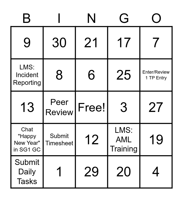 This bingo card has a free space and 24 words: Submit Timesheet, 1, 6, Submit Daily Tasks, 7, 9, LMS: Incident Reporting, 30, 3, 12, 25, 13, LMS: AML Training, 19, 8, 20, 27, 21, Enter/Review 1 TP Entry, Peer Review, 4, Chat "Happy New Year" in SG1 GC, 17 and 29.