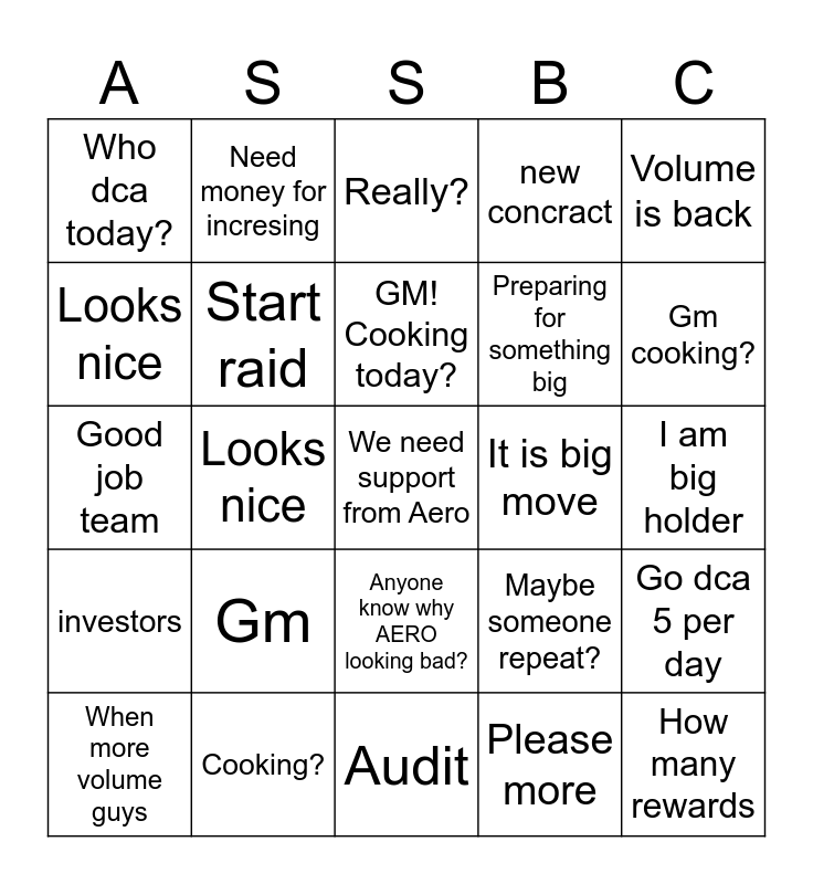 This bingo card has a free space and 24 words: Gm, Cooking?, GM! Cooking today?, When more volume guys, Volume is back, Who dca today?, Looks nice, Need money for incresing, It is big move, Anyone know why AERO looking bad?, Preparing for something big, Good job team, Maybe someone repeat?, Go dca 5 per day, Start raid, Please more, I am big holder, Really?, Gm cooking?, Looks nice, How many rewards, investors, new concract and Audit.
