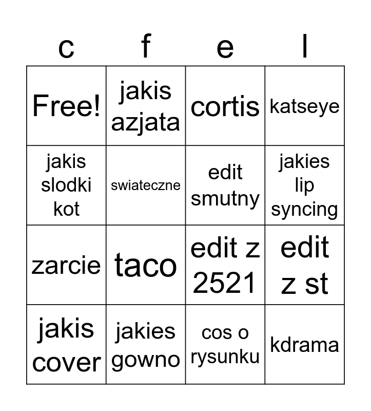 This bingo card has 16 words: jakis cover, jakies gowno, cortis, katseye, jakis slodki kot, jakis azjata, edit z 2521, edit z st, Free!, swiateczne, cos o rysunku, jakies lip syncing, zarcie, taco, edit smutny and kdrama.