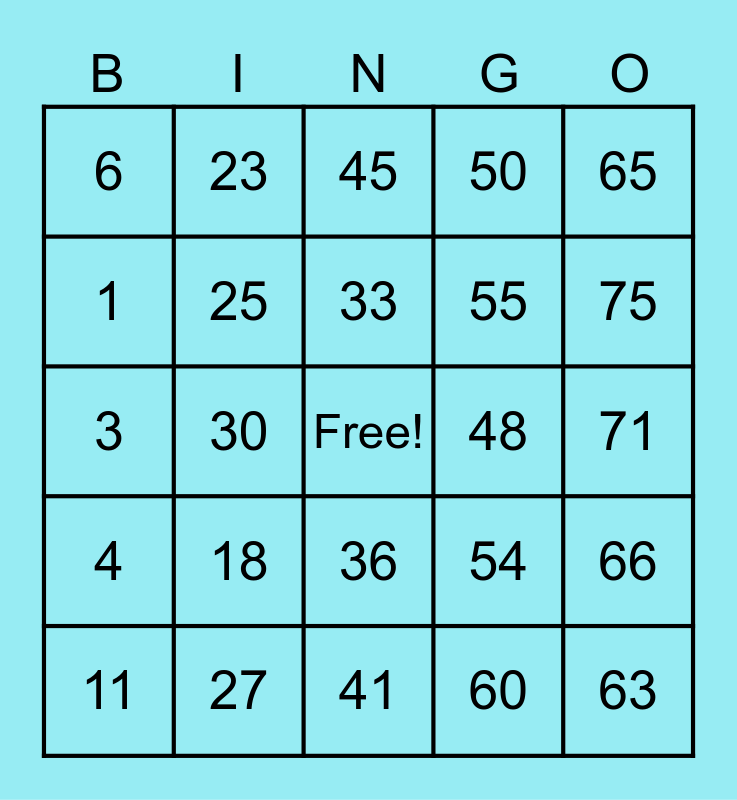 This bingo card has a free space and 24 words: 11, 18, 33, 60, 65, 6, 23, 45, 48, 71, 3, 25, 54, 66, 1, 27, 41, 50, 75, 4, 30, 36, 55 and 63.