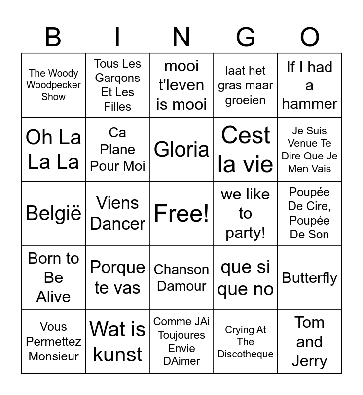 This bingo card has a free space and 62 words: ik hou van u, Wat is kunst, Mademoiselle Chante Le Blues, Born to Be Alive, Borriquito, Kom van dat dak af, Ca Plane Pour Moi, Je veux de l'amour, Cest la vie, Tombe La Neige, laat het gras maar groeien, We Are Family, Oh La La La, Pump Up The Jam, Wunderbar, The Woody Woodpecker Show, Tom and Jerry, If I had a hammer, Da Da Da, Gloria, we like to party!, mooi t'leven is mooi, Vous Permettez Monsieur, Crying At The Discotheque, Daddy Cool, Lost In France, For Me Formidable, Le Freak, Butterfly, Carnaval De Paris, Dansez Maintenant, De Vogeltjes Dans, Kvraagetaan, Ella elle la, Poupée De Cire, Poupée De Son, Tous Les Garqons Et Les Filles, heb je even voor mij, La Ballade Des Gens Heureux, Viens Dancer, La Vie En Rose, België, Tu Es Foutu (Tu M'as Promis...), Porque te vas, Allez Ola Ole, Je Suis Venue Te Dire Que Je Men Vais, que si que no, Et Si Tu N'existais, The Ketchup Song, Non Non Rien N A Changé, Kingston Kingston, Chanson Damour, Comme JAi Toujoures Envie DAimer, Ich bin wie du, U Can't Touch This, Paradise By the Dashboard Light, Pour Un Flirt, Les Lacs Du Connemara, To France, always look on the bright side of life, Désenchanté, Et Cest Parti... and goeiemorgen morgen.