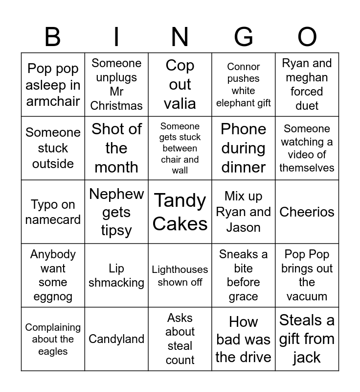 This bingo card has a free space and 33 words: Yelling during picture, Turbo boost, Nephew gets tipsy, Pixtures, Anybody want some eggnog, Shot of the month, Ryan and meghan forced duet, Complaining about the eagles, Someone unplugs Mr Christmas, Jason does IT, Someone gets stuck between chair and wall, Cop out valia, Frozen bread, Casual activity turned ranked, Mix up Ryan and Jason, Someone watching a video of themselves, Candyland, Typo on namecard, Lip shmacking, Sneaks a bite before grace, Lighthouses shown off, Unconvincing excuse to set out, Pop pop asleep in armchair, Cheerios, Asks about steal count, Steals a gift from jack, Connor pushes white elephant gift, Phone during dinner, Someone stuck outside, Pop Pop brings out the vacuum, If you dont give back the boxes..., How bad was the drive and Trump themed white elephant gift.