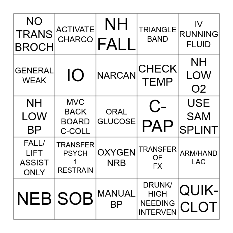 This bingo card has a free space and 24 words: TRANSFER PSYCH 1 RESTRAIN, SOB, NARCAN, NEB, IV RUNNING FLUID, NO TRANS BROCH, GENERAL WEAK, ACTIVATE CHARCO, C-PAP, OXYGEN NRB, CHECK TEMP, NH LOW BP, TRANSFER OF FX, ARM/HAND LAC, IO, DRUNK/ HIGH NEEDING INTERVEN, USE SAM SPLINT, NH FALL, NH LOW O2, MVC BACK BOARD C-COLL, QUIK- CLOT, FALL/ LIFT ASSIST ONLY, TRIANGLE BAND and MANUAL BP.