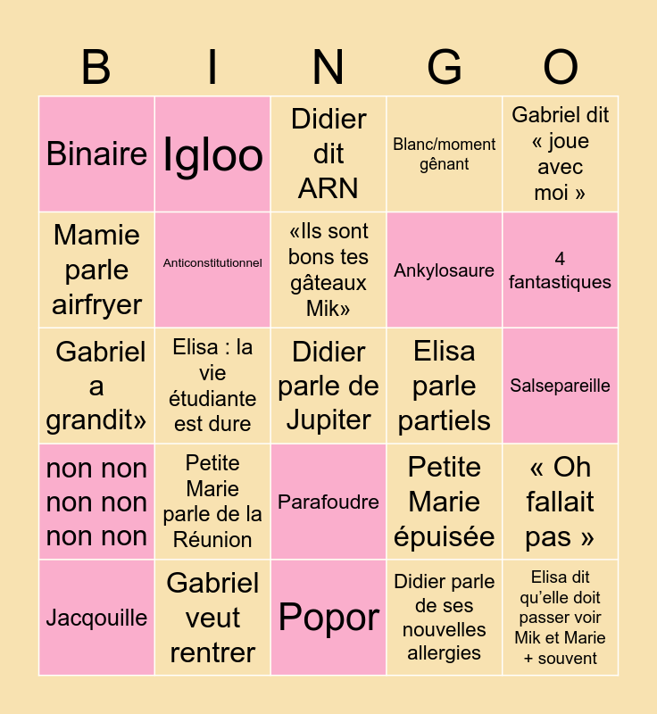 This bingo card has 25 words: Petite Marie parle de la Réunion, Popor, «Ils sont bons tes gâteaux Mik», Jacqouille, Gabriel dit « joue avec moi », Binaire, Mamie parle airfryer, Igloo, Elisa parle partiels, Parafoudre, Ankylosaure, Gabriel a grandit», Petite Marie épuisée, « Oh fallait pas », Anticonstitutionnel, Elisa dit qu’elle doit passer voir Mik et Marie + souvent, Salsepareille, Didier dit ARN, 4 fantastiques, Elisa : la vie étudiante est dure, Didier parle de Jupiter, Gabriel veut rentrer, non non non non non non, Blanc/moment gênant and Didier parle de ses nouvelles allergies.