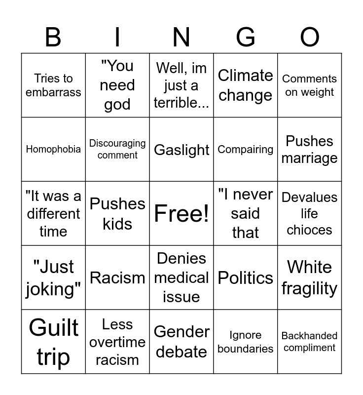 This bingo card has a free space and 24 words: Racism, Less overtime racism, Gaslight, Guilt trip, Comments on weight, Tries to embarrass, Homophobia, "You need god, "I never said that, Denies medical issue, Compairing, "It was a different time, Politics, White fragility, Discouraging comment, Ignore boundaries, Devalues life chioces, Well, im just a terrible..., Pushes marriage, Pushes kids, Backhanded compliment, "Just joking", Climate change and Gender debate.