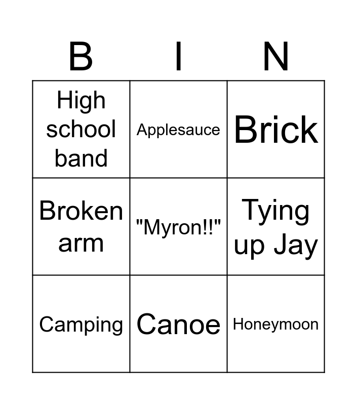 This bingo card has a free space and 8 words: Tying up Jay, Brick, Applesauce, Camping, High school band, Honeymoon, Broken arm and Canoe.