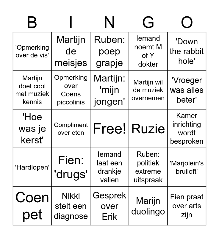 This bingo card has a free space and 24 words: Coen pet, Fien: 'drugs', Martijn: 'mijn jongen', Marijn duolingo, 'Down the rabbit hole', 'Opmerking over de vis', Martijn de meisjes, Ruben: poep grapje, Ruzie, Kamer inrichting wordt besproken, 'Hoe was je kerst', Opmerking over Coens piccolinis, Ruben: politiek extreme uitspraak, 'Marjolein's bruiloft', Martijn doet cool met muziek kennis, Nikki stelt een diagnose, Gesprek over Erik, Iemand noemt M of Y dokter, 'Vroeger was alles beter', 'Hardlopen', Compliment over eten, Iemand laat een drankje vallen, Martijn wil de muziek overnemen and Fien praat over arts zijn.