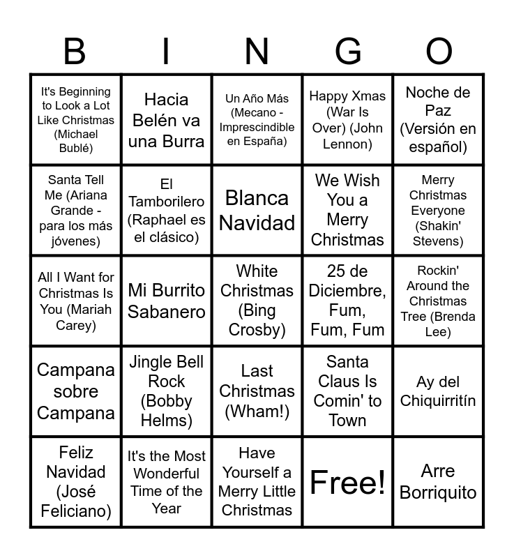 This bingo card has 1 images and 31 words: Free!, Mi Burrito Sabanero, Los Peces en el Río, Campana sobre Campana, El Tamborilero (Raphael es el clásico), Noche de Paz (Versión en español), Ay del Chiquirritín, Hacia Belén va una Burra, Arre Borriquito, Blanca Navidad, Un Año Más (Mecano - Imprescindible en España), Ya Vienen los Reyes Magos, El Camino que lleva a Belén, 25 de Diciembre, Fum, Fum, Fum, En Navidad (Rosana), Feliz Navidad (José Feliciano), All I Want for Christmas Is You (Mariah Carey), Last Christmas (Wham!), Jingle Bell Rock (Bobby Helms), Santa Claus Is Comin' to Town, Let It Snow! Let It Snow! Let It Snow! (Frank Sinatra/Dean Martin), Rockin' Around the Christmas Tree (Brenda Lee), It's the Most Wonderful Time of the Year, White Christmas (Bing Crosby), Happy Xmas (War Is Over) (John Lennon), We Wish You a Merry Christmas, Santa Tell Me (Ariana Grande - para los más jóvenes), It's Beginning to Look a Lot Like Christmas (Michael Bublé), Have Yourself a Merry Little Christmas, Driving Home for Christmas (Chris Rea) and Merry Christmas Everyone (Shakin' Stevens).