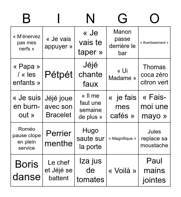 This bingo card has a free space and 24 words: Perrier menthe, Le chef et Jéjé se battent, Jéjé chante faux, Boris danse, « Avertissement », « M’énervez pas mes nerfs », « Papa » / « les enfants », « Je vais appuyer », « je fais mes cafés », Hugo saute sur la porte, « Ui Madame », « Je suis en burn-out », « Magnifique », Jules replace sa moustache, Pétpét, « Voilà », « Fais-moi une mayo », « Je vais te taper », Thomas coca zéro citron vert, Jéjé joue avec son Bracelet, Paul mains jointes, Roméo pause clope en plein service, Manon passe derrière le bar and Iza jus de tomates.