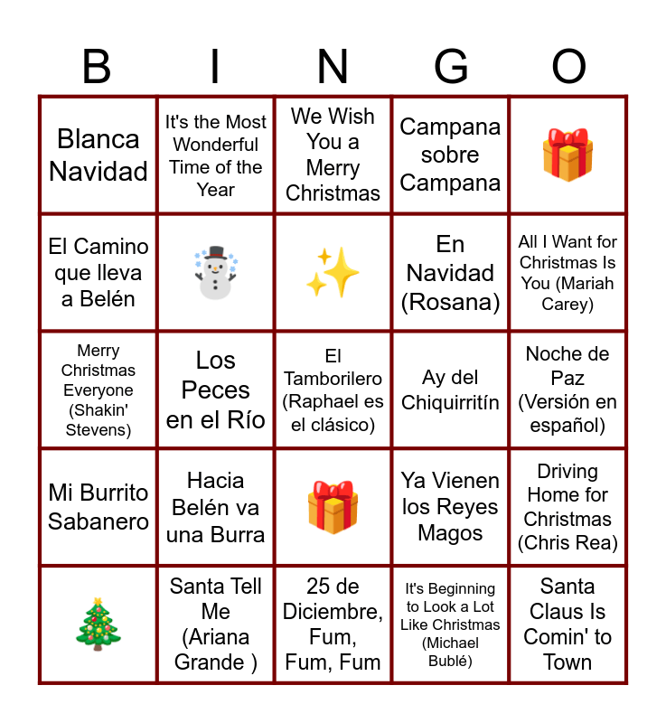 This bingo card has 39 words: Free!, 🎄, ✨, ☃️, 🎄, 🎁, ✨, ☃️, 🎁, Mi Burrito Sabanero, Los Peces en el Río, Campana sobre Campana, El Tamborilero (Raphael es el clásico), Noche de Paz (Versión en español), Ay del Chiquirritín, Hacia Belén va una Burra, Arre Borriquito, Blanca Navidad, Un Año Más (Mecano - Imprescindible en España), Ya Vienen los Reyes Magos, El Camino que lleva a Belén, 25 de Diciembre, Fum, Fum, Fum, En Navidad (Rosana), All I Want for Christmas Is You (Mariah Carey), Last Christmas (Wham!), Jingle Bell Rock (Bobby Helms), Santa Claus Is Comin' to Town, Let It Snow! Let It Snow! Let It Snow! (Frank Sinatra/Dean Martin), Rockin' Around the Christmas Tree (Brenda Lee), It's the Most Wonderful Time of the Year, White Christmas (Bing Crosby), Happy Xmas (War Is Over) (John Lennon), We Wish You a Merry Christmas, Santa Tell Me (Ariana Grande ), It's Beginning to Look a Lot Like Christmas (Michael Bublé), Have Yourself a Merry Little Christmas, Driving Home for Christmas (Chris Rea), Merry Christmas Everyone (Shakin' Stevens) and Feliz Navidad (José Feliciano).