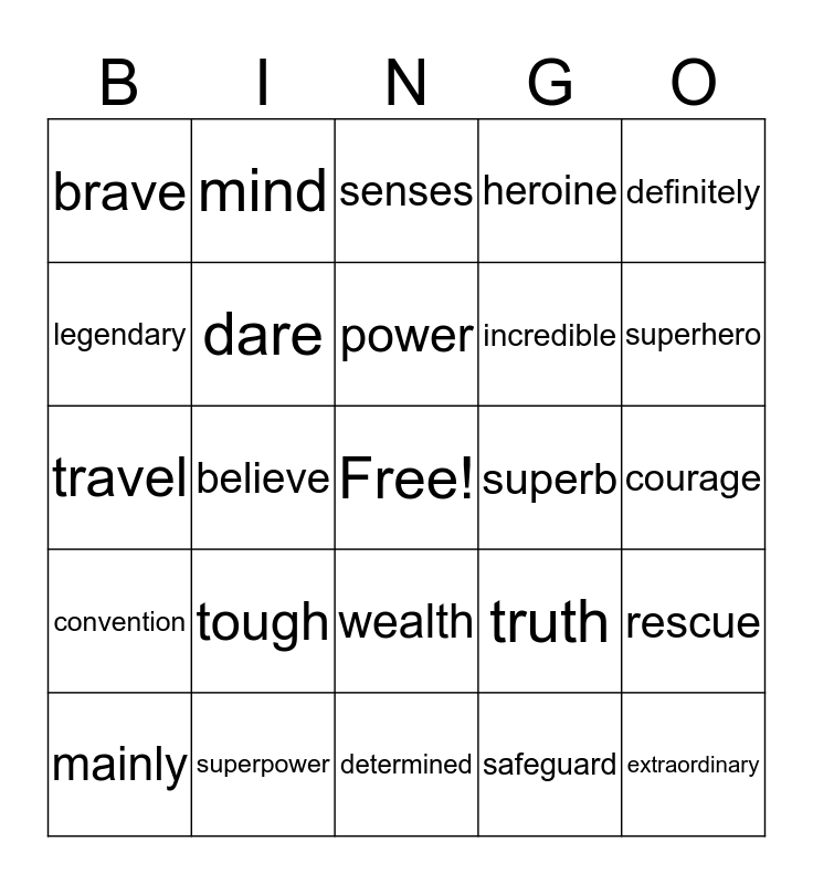 This bingo card has a free space and 33 words: alley, autograph, believe, coincidence, convention, dare, definitely, mainly, mind, possess, power, senses, shield, stupid, superb, superhero, superpower, travel, tough, truth, wealth, admire, brave, courage, determined, extraordinary, heroine, incredible, legendary, rescue, safe, safeguard and support.