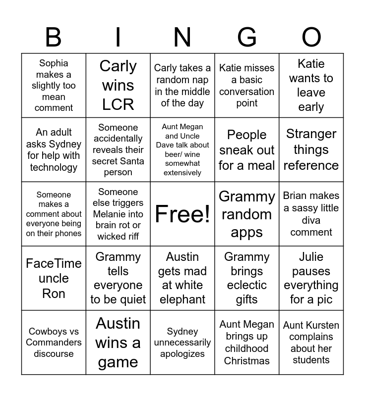 This bingo card has a free space and 24 words: Grammy tells everyone to be quiet, Austin wins a game, Aunt Megan and Uncle Dave talk about beer/ wine somewhat extensively, Cowboys vs Commanders discourse, Katie wants to leave early, Sophia makes a slightly too mean comment, An adult asks Sydney for help with technology, Carly wins LCR, Grammy random apps, Austin gets mad at white elephant, People sneak out for a meal, Someone makes a comment about everyone being on their phones, Grammy brings eclectic gifts, Julie pauses everything for a pic, Someone accidentally reveals their secret Santa person, Aunt Megan brings up childhood Christmas, Brian makes a sassy little diva comment, Carly takes a random nap in the middle of the day, Stranger things reference, Someone else triggers Melanie into brain rot or wicked riff, Aunt Kursten complains about her students, FaceTime uncle Ron, Katie misses a basic conversation point and Sydney unnecessarily apologizes.