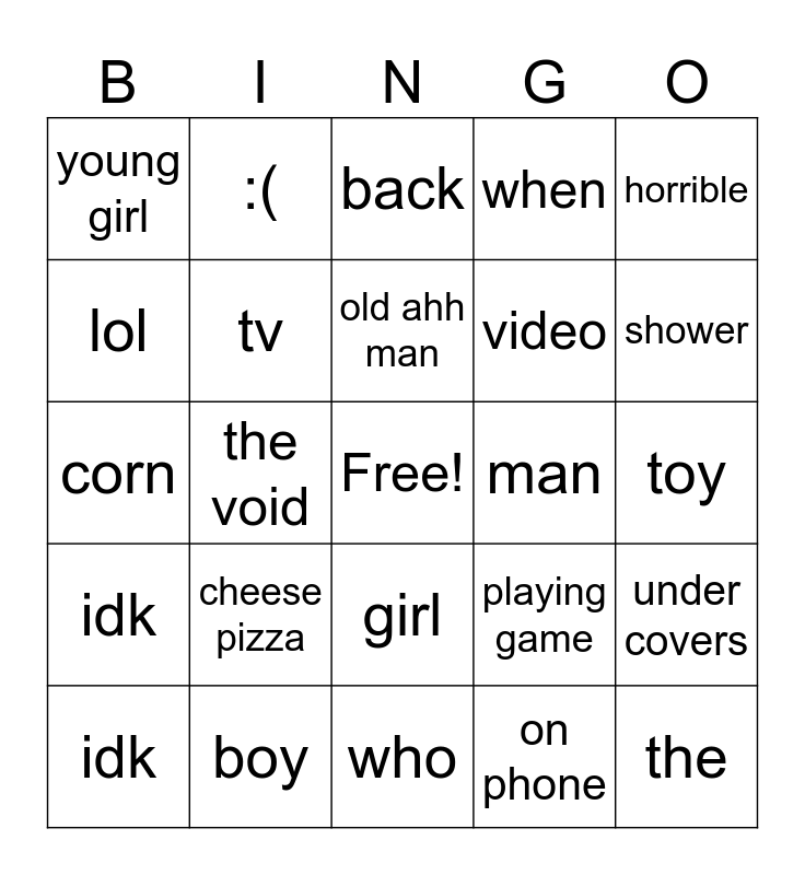 This bingo card has a free space and 24 words: cheese pizza, boy, old ahh man, idk, horrible, young girl, lol, :(, man, girl, video, corn, playing game, under covers, tv, on phone, toy, back, shower, the void, the, idk, when and who.