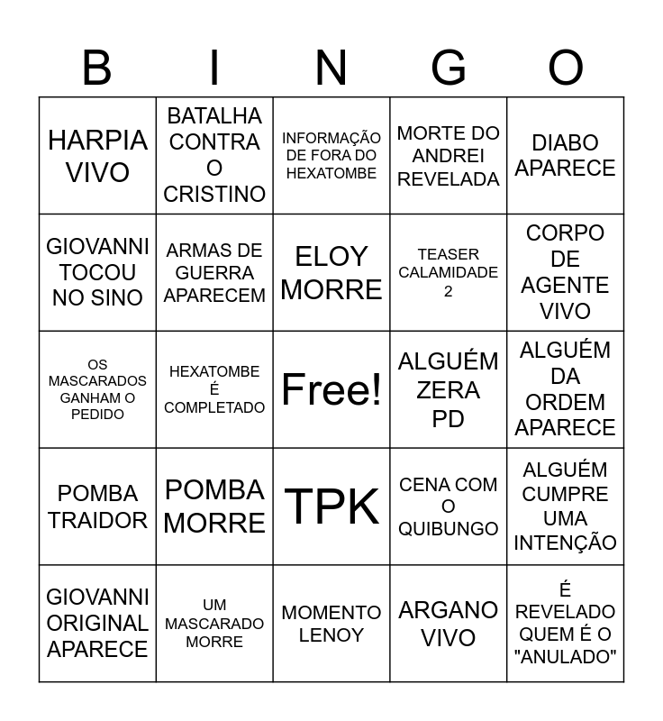 This bingo card has a free space and 24 words: POMBA MORRE, UM MASCARADO MORRE, ELOY MORRE, GIOVANNI ORIGINAL APARECE, DIABO APARECE, HARPIA VIVO, GIOVANNI TOCOU NO SINO, BATALHA CONTRA O CRISTINO, ALGUÉM ZERA PD, TPK, TEASER CALAMIDADE 2, OS MASCARADOS GANHAM O PEDIDO, CENA COM O QUIBUNGO, ALGUÉM CUMPRE UMA INTENÇÃO, ARMAS DE GUERRA APARECEM, ARGANO VIVO, ALGUÉM DA ORDEM APARECE, INFORMAÇÃO DE FORA DO HEXATOMBE, CORPO DE AGENTE VIVO, HEXATOMBE É COMPLETADO, É REVELADO QUEM É O "ANULADO", POMBA TRAIDOR, MORTE DO ANDREI REVELADA and MOMENTO LENOY.