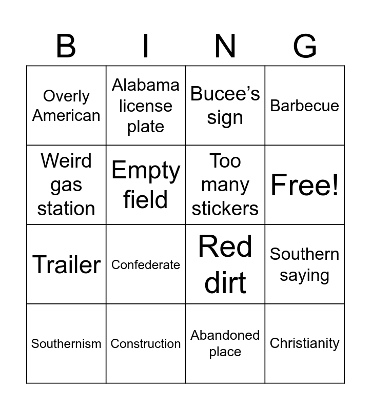 This bingo card has 18 words: Confederate, Christianity, Bucee’s sign, Overly American, Red dirt, Barbecue, Southernism, Alabama license plate, Free!, Trailer, Abandoned place, Weird gas station, Southern saying, Empty field, Too many stickers, Gun store, Construction and Jackass.