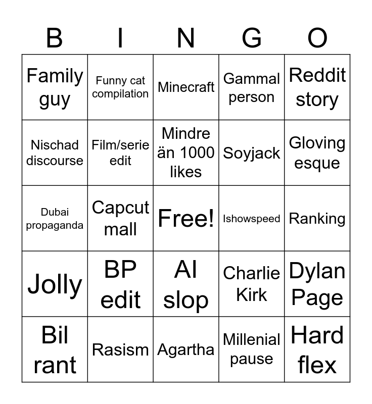 This bingo card has a free space and 24 words: BP edit, Rasism, Mindre än 1000 likes, Bil rant, Reddit story, Family guy, Nischad discourse, Funny cat compilation, Ishowspeed, AI slop, Soyjack, Dubai propaganda, Charlie Kirk, Dylan Page, Film/serie edit, Millenial pause, Ranking, Minecraft, Gloving esque, Capcut mall, Hard flex, Jolly, Gammal person and Agartha.