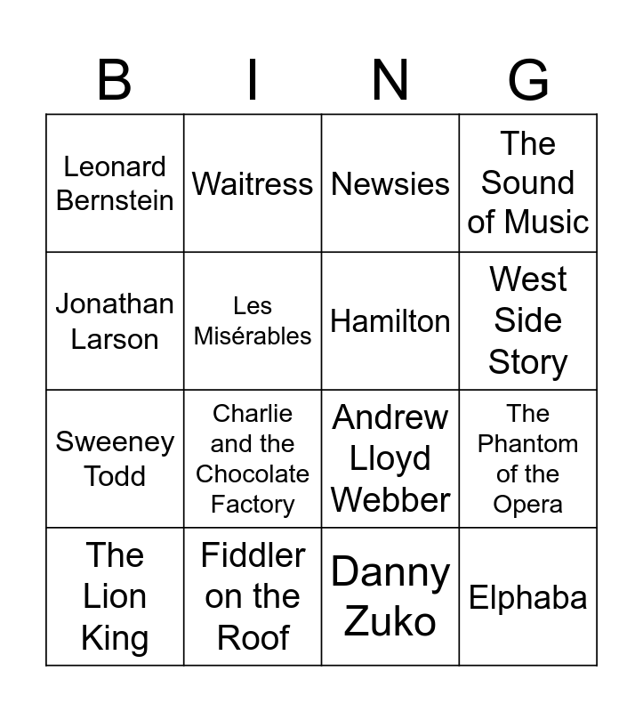 This bingo card has 40 words: Wicked, Andrew Lloyd Webber, Paris, Hamilton, Cats, Audrey II, West Side Story, Cabaret, Jonathan Larson, Elphaba, The Phantom of the Opera, The Sound of Music, The Lion King, Danny Zuko, Fiddler on the Roof, Six, Rent, Leonard Bernstein, Sister Act, Newsies, ABBA, Murder on the Orient Express, Sweeney Todd, Les Misérables, Chicago, Kinky Boots, Evita, Stephen Sondheim, The Wizard of Oz, The 25th Annual Putnam County Spelling Bee, Little Shop of Horrors, Mamma Mia!, Hairspray, Matilda the Musical, Charlie and the Chocolate Factory, Sunshine on Leith, An American in Paris, Love Never Dies, Waitress and MJ the Musical.