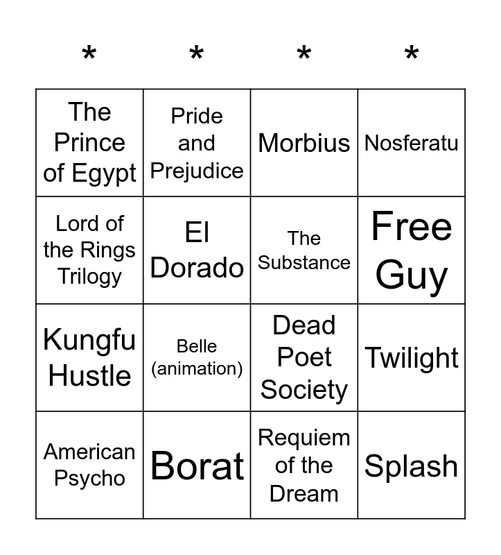 This bingo card has 16 words: Borat, Twilight, Morbius, The Prince of Egypt, Kungfu Hustle, Pride and Prejudice, Dead Poet Society, Requiem of the Dream, Lord of the Rings Trilogy, El Dorado, American Psycho, Nosferatu, Belle (animation), Free Guy, The Substance and Splash.