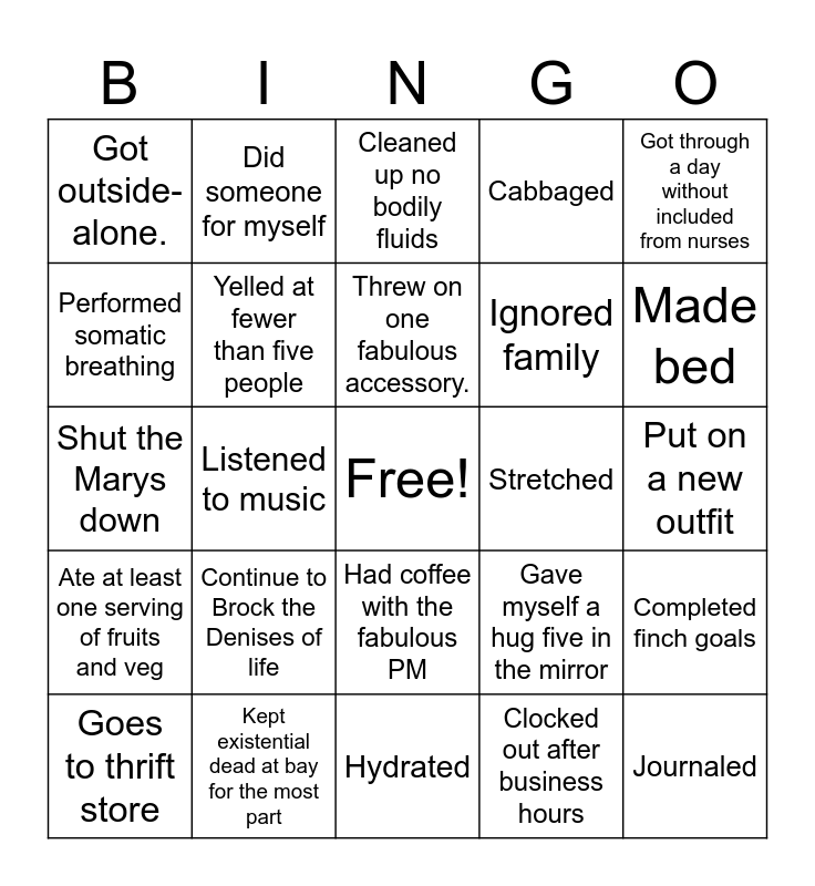 This bingo card has a free space and 24 words: Goes to thrift store, Continue to Brock the Denises of life, Threw on one fabulous accessory., Clocked out after business hours, Got through a day without included from nurses, Got outside-alone., Did someone for myself, Cleaned up no bodily fluids, Stretched, Put on a new outfit, Shut the Marys down, Yelled at fewer than five people, Gave myself a hug five in the mirror, Completed finch goals, Performed somatic breathing, Kept existential dead at bay for the most part, Hydrated, Cabbaged, Made bed, Ate at least one serving of fruits and veg, Listened to music, Had coffee with the fabulous PM, Ignored family and Journaled.