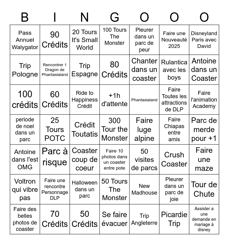 This bingo card has 49 words: Pleurer dans un parc de joie, Rulantica avec les boys, Trip Angleterre, 25 Tours POTC, Ride to Happiness Crédit, Parc de merde pour +1, 90 Crédits, 50 Crédits, Faire une Nouveauté 2025, Faire 10 photos dans un coaster entre pote, Disneyland Paris avec David, 100 Tours The Monster, Faire Toutes les attractions de DLP, Phantasialand, Faire une rencontre Personnage DLP, Faire Chiapas entre amis, Trip Pologne, Antoine dans un Coaster, Tour de Chute, Pleurer dans un parc de peur, Chanter dans un coaster, Crédit Toutatis, Pass Annuel Walygator, Rencontrer 1 Dragon de Phantasialand, Faire des belles photos de coaster, Trip Espagne, Faire l'animation Academy, 70 Crédits, +1h d'attente, 60 Crédits, Assister a une demande en mariage à disney, Faire luge alpine, Voltron qui vibre pas, Halloween dans un parc, periode de noel dans un parc, 50 visites de parcs, Crush Coaster, Faire une maze, 100 crédits, Coaster coup de coeur, 50 Tours The Monster, Antoine dans l'est OMG, 300 Tour the Monster, Se faire évacuer, 80 Crédits, 20 Tours It's Small World, New Madhouse, Parc à risque and Picardie Trip.